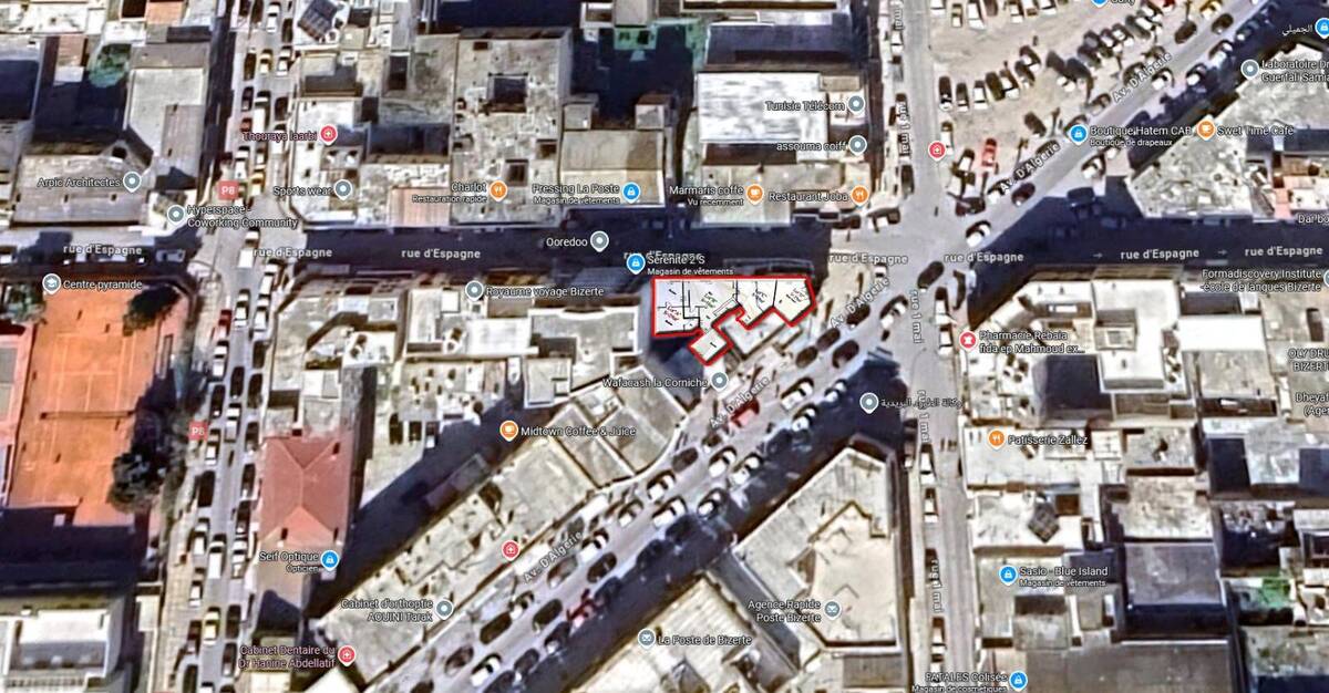 Situé à l’intersection de trois artères majeures : l’Avenue d’Algérie, la Rue d’Espagne et la Rue du 1er Mai – juste en face de la Poste centrale, en face de l’iconique pâtisserie Zallez et à proximité immédiate de quatre Complexes Commerciaux et de Bureaux, vous êtes ici au cœur du dynamisme bizertin.
