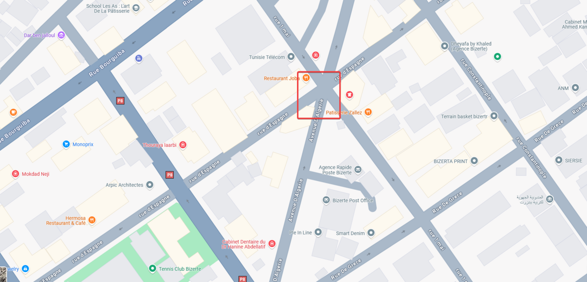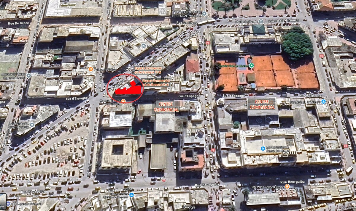 Situé à l’intersection de trois artères majeures : l’Avenue d’Algérie, la Rue d’Espagne et la Rue du 1er Mai – juste en face de la Poste centrale, en face de l’iconique pâtisserie Zallez et à proximité immédiate de quatre Complexes Commerciaux et de Bureaux, vous êtes ici au cœur du dynamisme bizertin.
